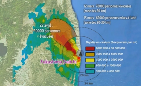 | Le séisme et le tsunami du 11 mars 2011 ont provoqué le plus grave accident nucléaire civil depuis Tchernobyl en 1986. La centrale japonaise a perdu ses systèmes de refroidissement, dans trois réacteurs s’est formé un corium qui a percé la cuve. Des explosions ont endommagé les bâtiments des réacteurs et d’une piscine d’entreposage du combustible. Les rejets radioactifs atmosphériques et océaniques ont duré plusieurs mois. Selon le bilan établi par des physiciens français du CNRS, les émissions de Fukushima représentent 10% de celles de l’accident de Tchernobyl pour l’iode et d’un tiers pour le césium. 600 km2 de territoire sont fortement contaminés par le césium 137. |