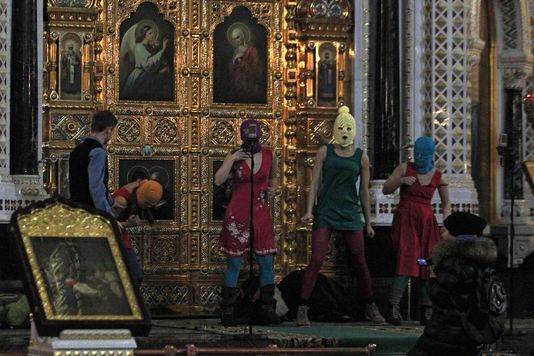 Le 21 février 2012, cinq membres du collectif avaient pénétré masqués dans la cathédrale moscovite du Christ-Sauveur, haut lieu du renouveau orthodoxe en Russie, pour y déclamer, en musique et devant l’autel, un Te Deum revisité à la sauce punk demandant à la Vierge Marie de chasser Poutine (« Vierge Marie, mère de Dieu, chasse Poutine, chasse Poutine, chasse Poutine »).