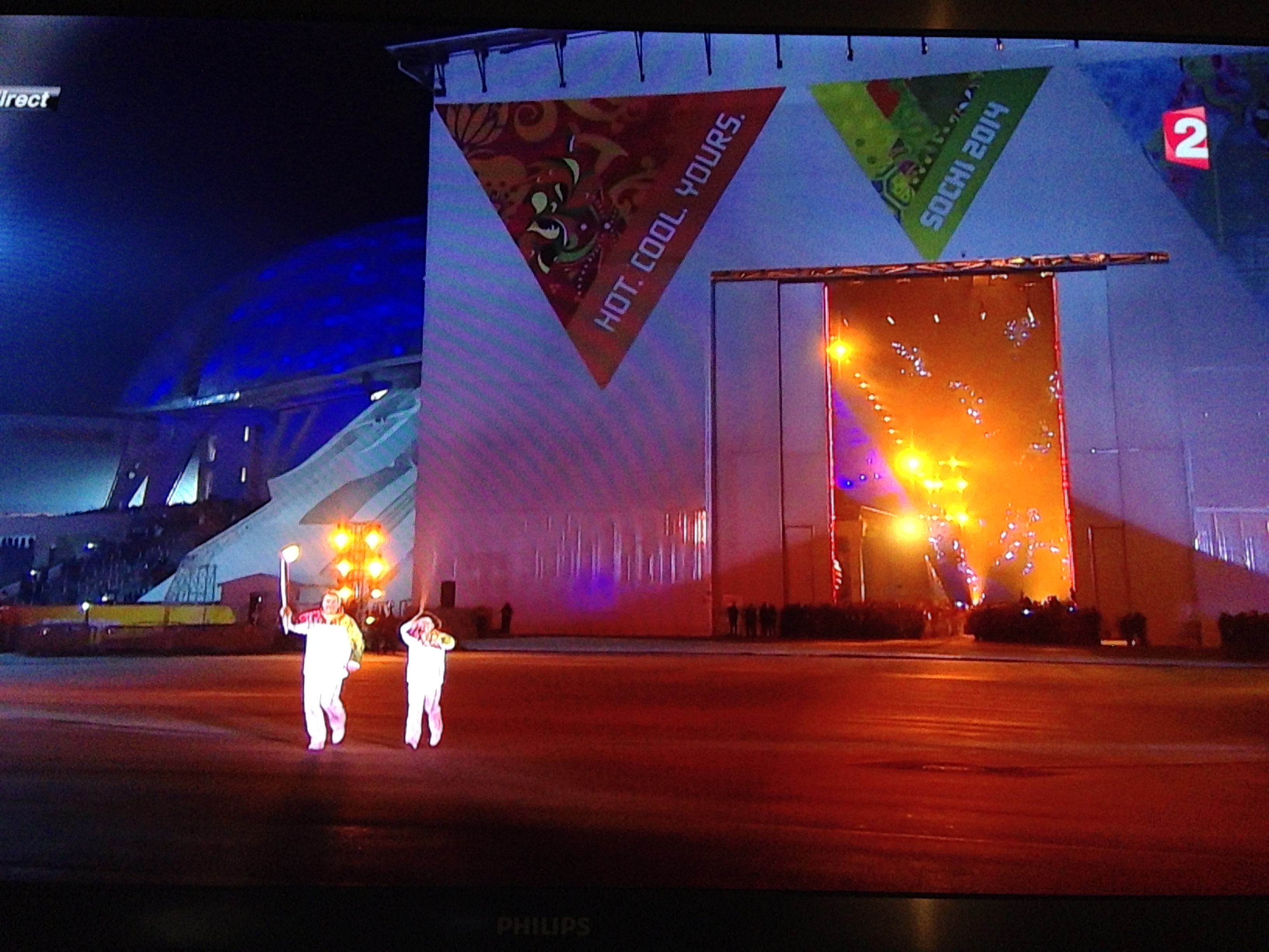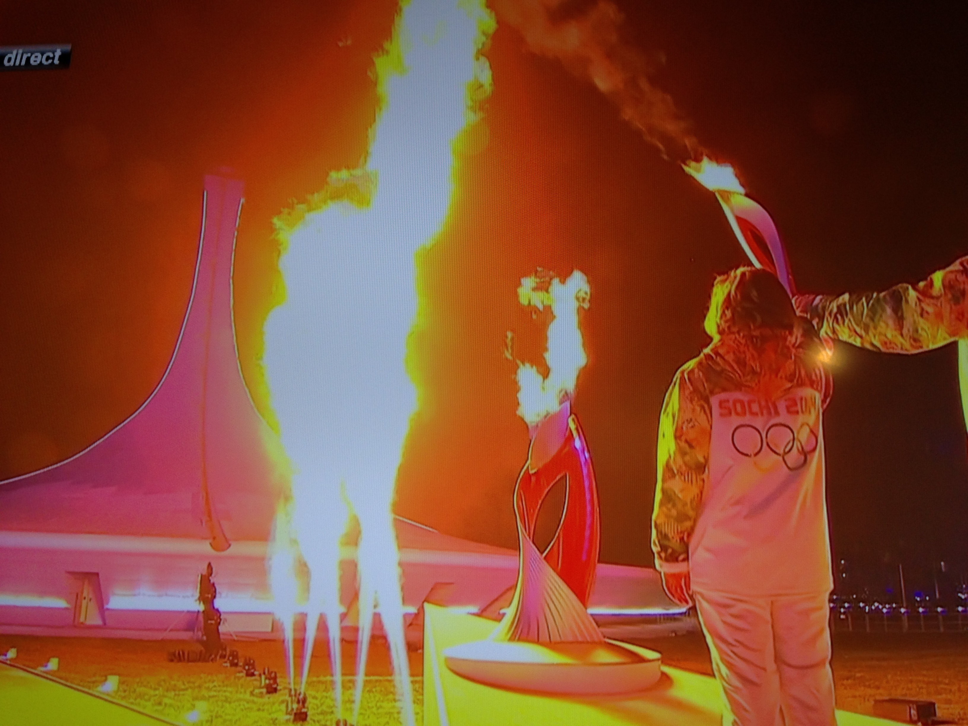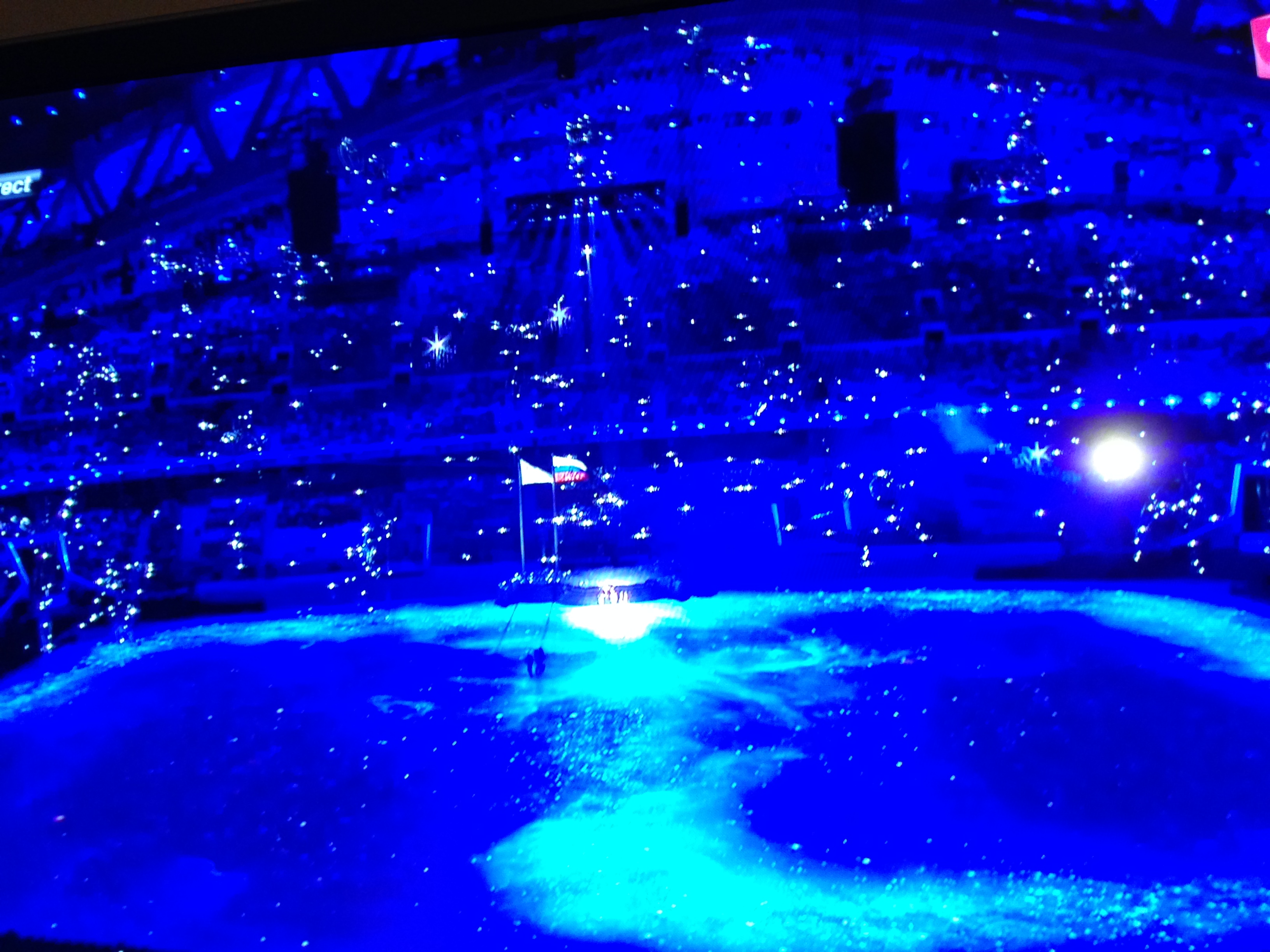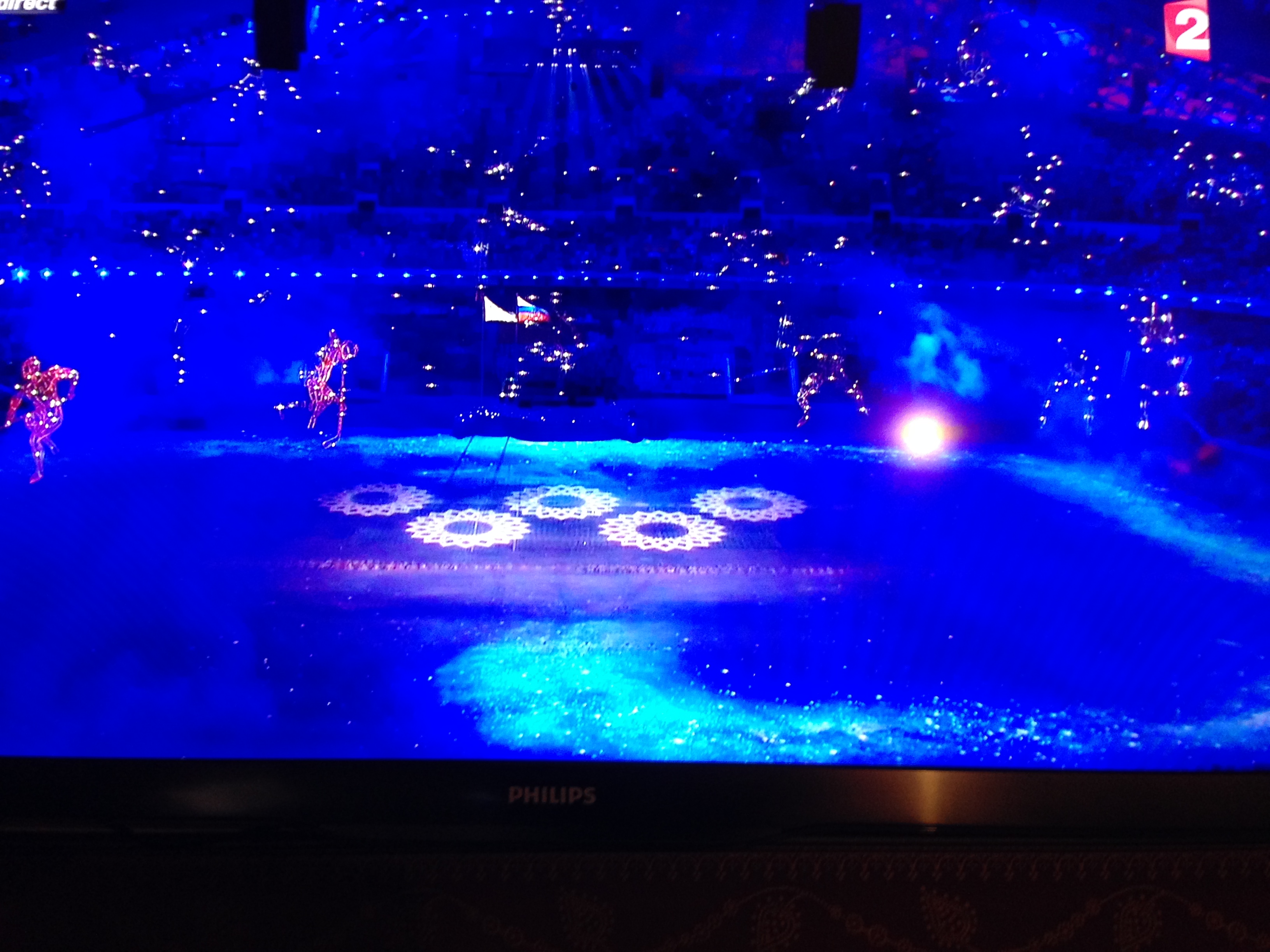 Quatre des cinq anneaux du drapeau olympique sont apparus dans le stade Fisht, mais le dernier ne s’est pas matérialisé, sans doute à cause d’un problème technique
