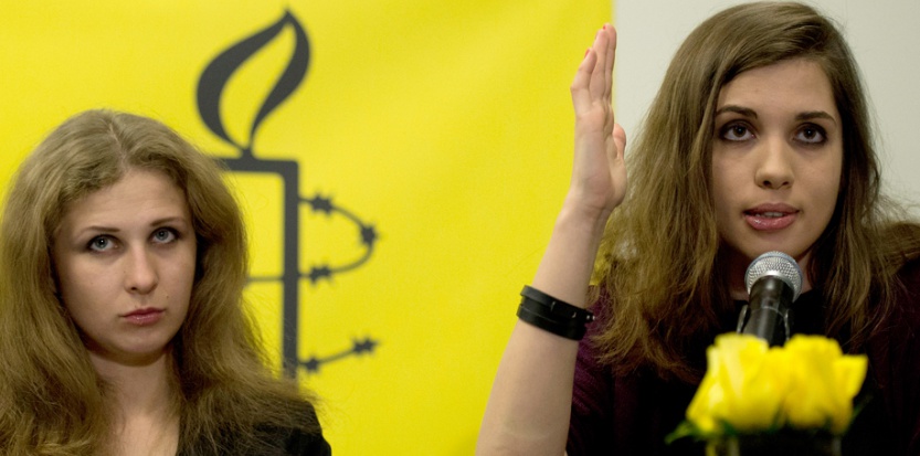 Les Etats-Unis sont la dernière étape de la tournée internationale de Maria Alekhina, 25 ans, et Nadejda Tolokonnikova, 24 ans, entamée peu après leur libération après 21 mois de détention. Trois des cinq Pussy Riot avaient été emprisonnées pour avoir chanté en février 2012 une « prière punk » contre Vladimir Poutine dans la cathédrale du Christ-Sauveur à Moscou. Comme lors de leurs précédentes étapes, les jeunes femmes se sont exprimées mardi au nom des femmes, des homosexuels et des prisonniers dont les droits, dénoncent-elles, sont bafoués par le gouvernement de Vladimir Poutine. Elles ont également appelé à davantage de transparence politique. Lors de cette conférence de presse donnée depuis les bureaux d’Amnesty International à New York, on leur a demandé ce qu’elles aimeraient dire à Barack Obama et à son homologue russe. Nadejda Tolokonnikova a enjoint le président américain à ne pas « craindre de dire publiquement son opinion sur la situation en Russie lors de sa prochaine visite ». Et à Vladimir Poutine, elle demanderait: « Vous n’en avez pas marre de tout ça ? ». A l’occasion de l’ouverture vendredi des jeux Olympiques de Sotchi en Russie, les deux femmes ont à nouveau appelé les touristes à ne pas oublier les problèmes de la Russie derrière les festivités. « Nous souhaitons que les Américains regardent vraiment la Russie et la voient au-delà des images véhiculées par les Jeux », a asséné Maria Alekhina.Organisé par Amnesty International, le concert à New York réunissait plusieurs têtes d’affiches, comme Madonna, qui dit avoir reçu des menaces de mort après avoir soutenu publiquement les Pussy Riot lors d’un concert à Moscou en août 2012. « Il est temps que le reste du monde soit aussi courageux que les Pussy Riot et affronte les autres gens comme Poutine ou d’autres leaders et d’autres organisations qui ne respectent pas les droits de l’homme et entretiennent la discrimination et l’injustice », a déclaré la star en introduisant les deux jeunes Russes.