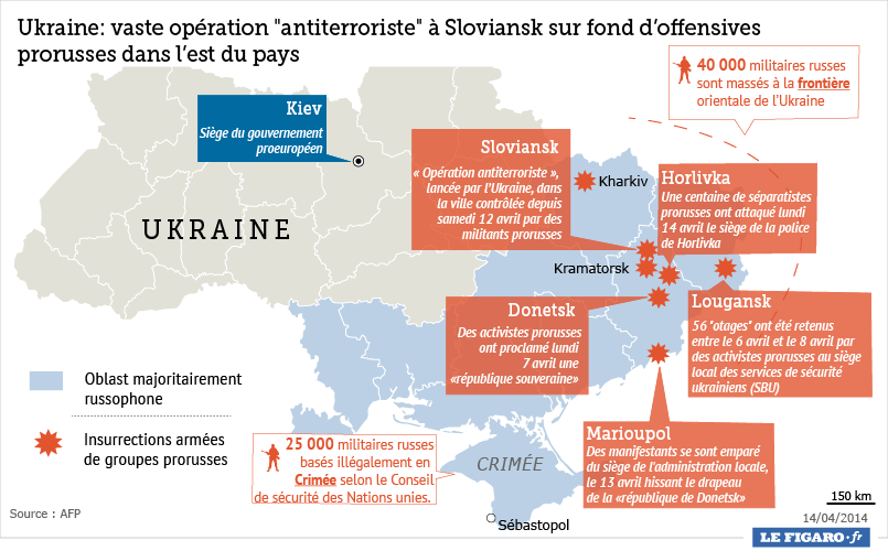L’Ukraine a lancé ses forces, armée et Garde nationale, dans l’Est contre les insurgés prorusses. Une colonne de blindés et d’hommes des forces spéciales se trouve à une quarantaine de kilomètres au nord de Sloviansk et des renforts sont héliportés près de cette localité symbole de la récente offensive séparatiste, tenue par des hommes en armes sans signes distinctifs. Par ailleurs, des unités de l’armée ukrainienne ont lancé une « opération spéciale » pour reprendre l’aéroport de Kramatorsk, dans l’est du pays, avant de se replier dans la base aérienne pour se mettre à l’abri d’une foule hostile.