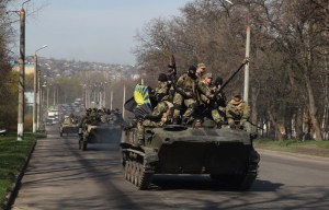 Armed people move on the few APC in the eastern Ukrainian city of Kramatorsk on April 16, 2014. Russian leader Vladimir Putin warned that Ukraine is on the verge of civil war, the Kremlin said Wednesday, after the Kiev government sent in troops against pro-Moscow separatists in the east of the country.
