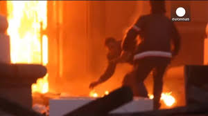 People watch as firefighters work at the burned Trade Union building late on May 2, 2014 in Odessa. More than 30 people were killed in a « criminal » blaze in Ukraine’s southern city of Odessa, as violence spread across the country during the bloodiest day since Kiev’s Western-backed government took power.