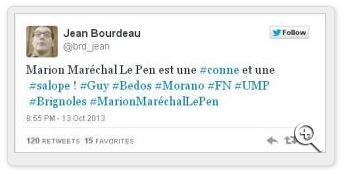 L’attaché n’hésite d’ailleurs pas à traiter Marion Maréchal-Le Pen aussi bien de « conne » que de « salope ». Non pas totalement gratuites et dénuées de sens, ces termes font écho à ceux employés par l’humoriste Guy Bedos à l’encontre de Nadine Morano lors d’une représentation dans la ville de Toul, attaque d’ailleurs traînée devant les tribunaux par la politicienne. Jean Bourdeau ne cache d’ailleurs pas ce clin d’œil, qu’il confirme du tweet « Vive Guy Bedos ».