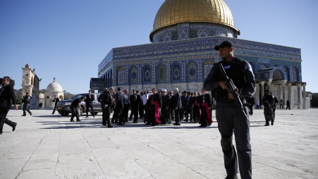 Flanked by a large phalanx of men in suits, Francis arrives on the Temple Mount, where he is being taken on a tour by the grand mufti of Jerusalem.