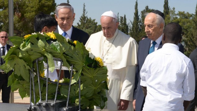Francis, flanked by Peres and Netanyahu, lays a wreath at Herzl’s grave and marks a moment of silence at the site. He had originally been planned to be whisked away to nearby Yad Vashem right after, but while at the Mount Herzl military cemetery, Francis will apparently make an unscheduled stop at a monument for terror victims, at the request of Netanyahu.