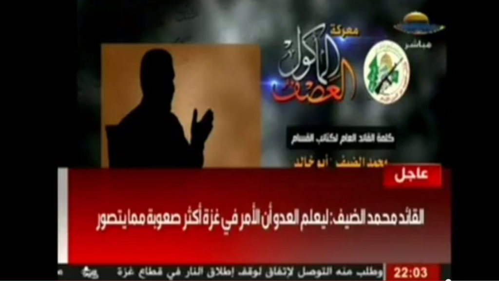 Izz ad-Din al-Qassam Brigades’s chief Muhammad Deif delivering a recorded address after a Hamas terrorist infiltration into Israel, July 30, 2014.