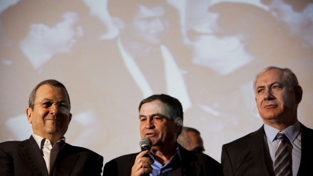 Prime Minister Benjamin Netanyahu (right) former deputy chief of staff and national security adviser Uzi Dayan (center) and Defense Minister Ehud Barak (AP/Oded Balilty)