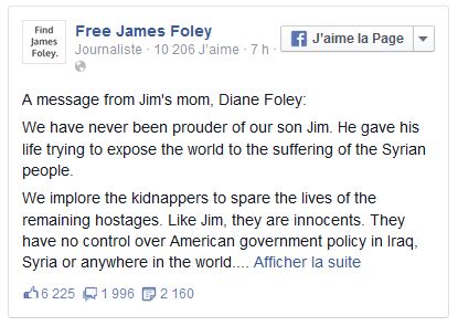 « Nous n’avons jamais été aussi fiers de notre fils Jim », a réagi sa mère, Diane Foley, dans un message sur Facebook. « Il a donné sa vie en essayant de montrer au monde les souffrances du peuple syrien. » « Nous implorons les ravisseurs d’épargner la vie des autres otages. Comme Jim, ils sont innocents. Ils n’ont aucun pouvoir sur la politique du gouvernement américain en Irak, en Syrie ou ailleurs dans le monde », a-t-elle ajouté.