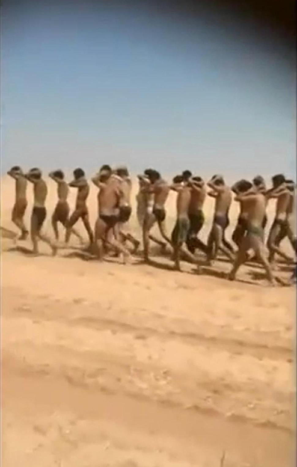 Horrific pictures shows Islamic state terrorists lining up 250 nearly naked Syrian soldiers and marching them through the desert before their brutal executions.