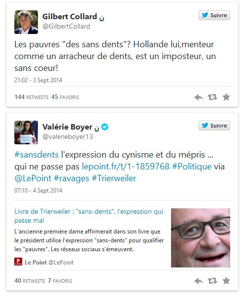 | A sa gauche, François Hollande trouve aussi des personnalités politiques pour récupérer les «sans-dents». Le Parti de gauche de Jean-Luc Mélenchon estime que François Hollande «est condescendant». «Nous sommes du camp des #SansDents», lancent-ils surTwitter. De son côté, Gilbert Collard en profite aussi pour glisser un bon mot sur Twitter, voyant en François Hollande un «imposteur et un sans-coeur». À l’UMP, la députée Valérie Boyer parle de « l’expression du cynisme et du mépris qui ne passe pas ». |