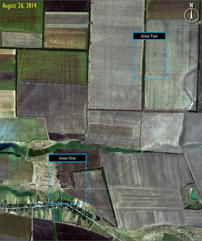 Les photos du 26 août 2014 montrent six obusiers relativement avancés (probablement des 2S19 Msta-S 152-mm) en position de tir,