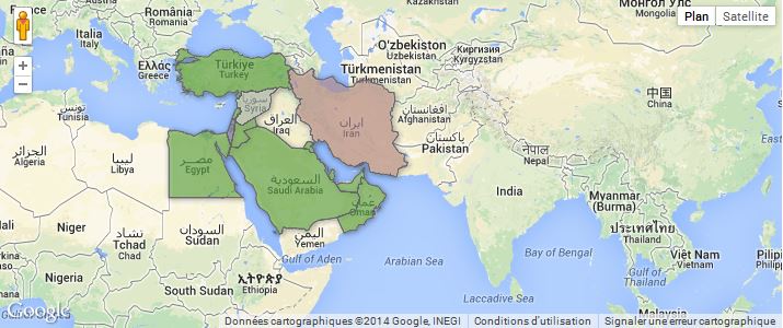 En vert, les pays participant à la réunion de Jeddah, avec John Kerry. Dans les autres couleurs, les Etats mis au ban de cette rencontre internationale.