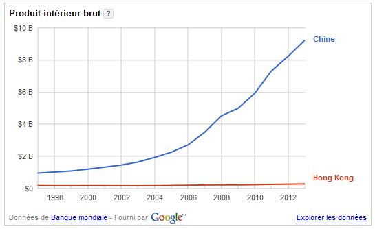Si, en 1997, la Chine comptait 216 fois plus d’habitants que Hongkong, elle n’avait un poids économique que moins de 6 fois supérieur. Mais, en moins de vingt ans, l’économie chinoise s’est développée à un rythme bien plus rapide. En 2013, le produit intérieur brut (PIB) chinois représentait 33,7 fois celui de Hongkong.