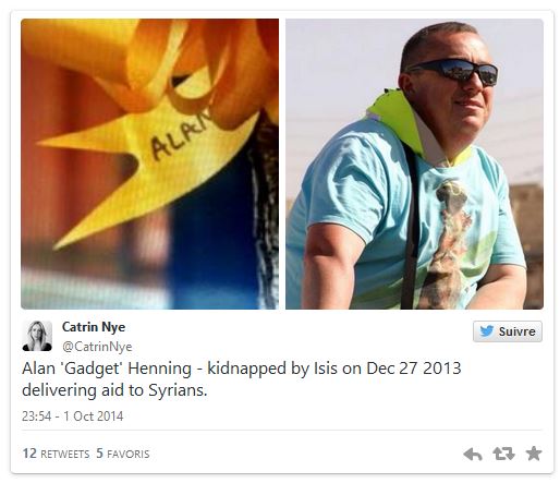 « Je suis Alan Henning, à cause de la décision de notre Parlement d’attaquer l’Etat islamique, en tant que Britannique, je vais payer le prix de cette décision. » Dans une vidéo diffusée vendredi 3 octobre, les djihadistes de l’Etat islamique (EI) ont revendiqué l’assassinat de l’otage britannique Alan Henning, capturé en décembre 2013 alors qu’il accompagnait un convoi qui acheminait de l’aide médicale en Syrie.
