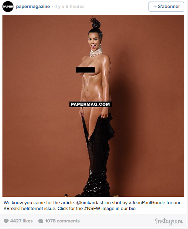Si vous-vous demandez s’il existe une version non-censurée, la réponse est oui : juste ici, sur le site de Paper Magazine. Sans ces barres noires, on retrouve une Kim aussi nue que dans sa sex-tape, dévoilant sans complexes sa poitrine, ses fesses, et même son entrejambe, juste pour les beaux yeux de Jean-Paul Goude. Car ce shooting ne lui a pas rapporté un sou : comme le rapporte TMZ, elle n’a pas demandé un centime, désirant simplement avoir l’opportunité de travailler avec l’artiste. Une collaboration gratuite mais fructueuse : alors qu’ils ne devaient faire qu’une seule photo ensemble, ils se sont emballés et en ont fait plusieurs. Quelle générosité !