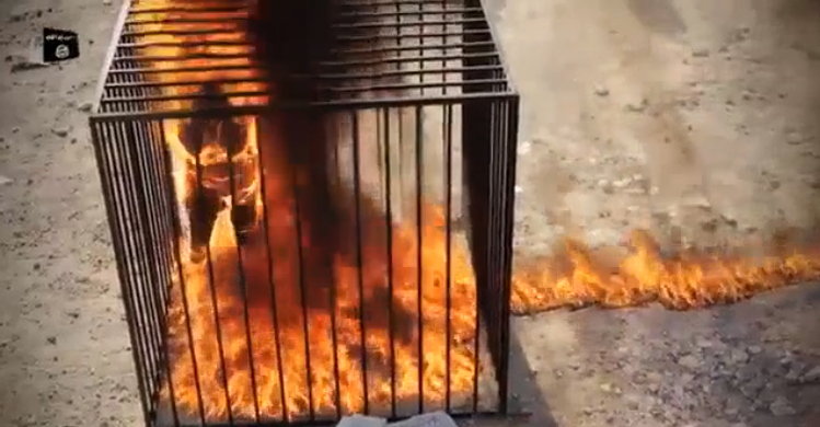 On y voit le prisonnier dans une cage, sa tunique imbibé de liquide inflammable de même que le sol de sa cage, puis le feu est mis par une trainée de liquide et le captif est brûlé vif. Plus tard, les djihadistes exhibent le corps brûlé.