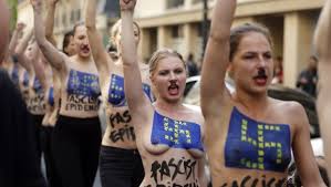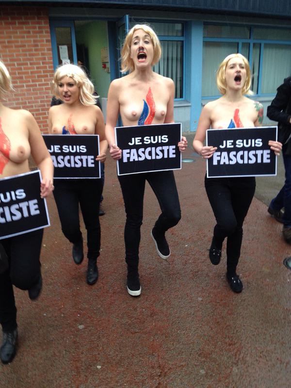 protestant seins nus et brandissant des pancartes « Je suis fasciste » en référence au slogan « Je suis Charlie« , créé après les attentats du mois de janvier. Le groupe d’activistes a par ailleurs revendiqué cette action menée « contre le Front national » sur Twitter.