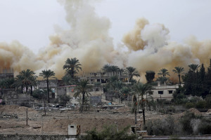 FILE – In this Nov. 4, 2014 file photo, smoke rises from explosions demolishing houses on the Egyptian side of the border town of Rafah as seen from the Palestinian side of Rafah in the southern Gaza Strip. The Egyptian army is doubling the size of a buffer zone along the Gaza border, an operation that will involve the destruction of 1,220 homes and the eviction of residents, military officials said Thursday, Jan. 8, 2015.(AP Photo/Adel Hana, File)
