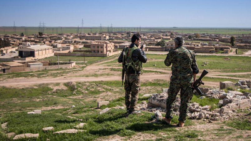 Deux combattants kurdes syriens (les YPG) observent lundi le bourg de Tel Hamis, dans la province d’al-Hasaka, qu’ils ont repris à l’État islamique, le 27 février.