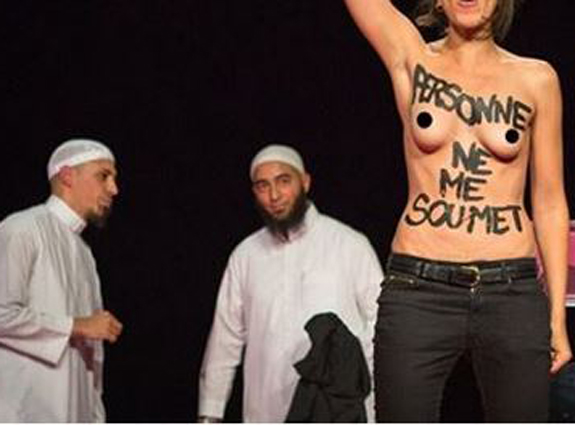 Les « deux imams étaient en train de parler de la question de savoir s’il faut battre ou non sa femme », quand les deux militantes âgées de 25 et 31 ans, sont montées sur la scène, a raconté Inna Shevchenko, porte-parole des Femen à Paris. Elles ont crié, en arabe et en français, des slogans qui étaient également peints sur leurs seins et leur dos: « personne ne me soumet, personne ne me possède, je suis mon propre prophète », a-t-elle ajouté, précisant que les deux jeunes femmes étaient d’origine algérienne et tunisienne.