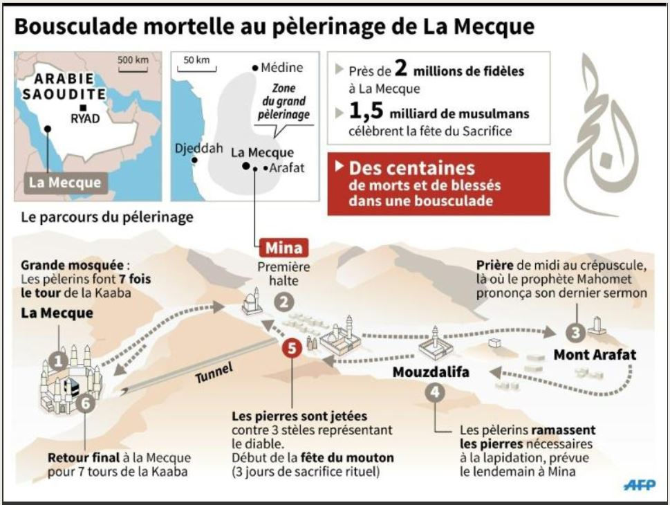 Jeudi, 769 pèlerins de différentes nationalités ont été tués et 934 blessés dans une bousculade sur le site de la lapidation des stèles à Mina près de La Mecque, selon un dernier bilan officiel, Ryad se trouvant depuis sous le feu des critiques pour une organisation du hajj jugée défaillante.