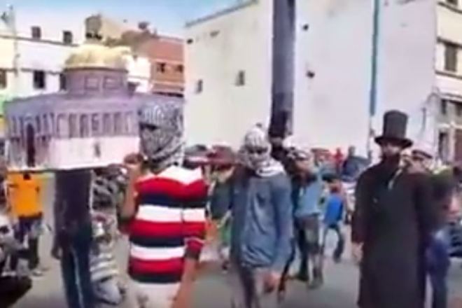La vidéo montre des jihadistes menant des juifs religieux, mains attachés dans le dos, mitrailleuses pointées sur le crane vers la mise à mort. D’autres jihadistes, le visage masqués d’un keffieh, porte le Dome du Rocher reconstitué en maquette).