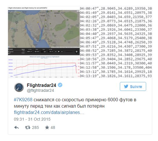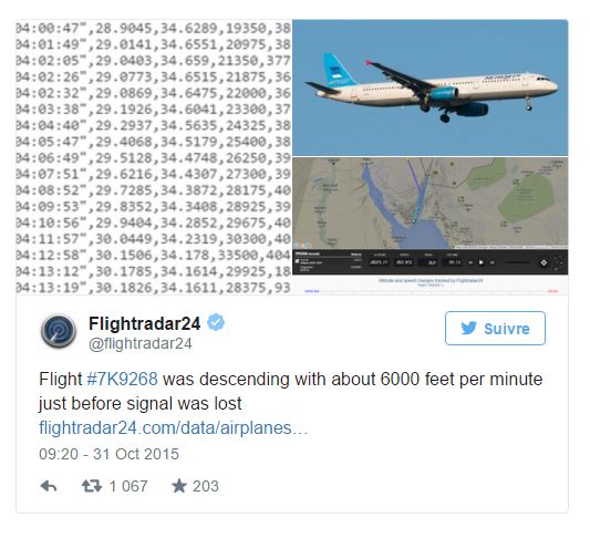 Le groupe Etat islamique en Egypte affirme sur Twitter avoir abattu l’avion russe. « Les soldats du Califat ont réussi à faire tomber un avion russe dans la province du Sinaï transportant plus de 220 croisés qui ont tous été tués », a indiqué le groupe extrémiste dans un communiqué, indiquant avoir agi en représailles à l’intervention russe en Syrie.