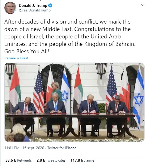 Cette paix parrainée par le Président Donald Trump, révolutionnant les esprits et les mentalités, n’a été possible, que parce qu’Israël a été libéré du carcan haineux de l’euro-djihadisme qui lui imposait des conditions de paix suicidaires pour maintenir l’état de guerre.