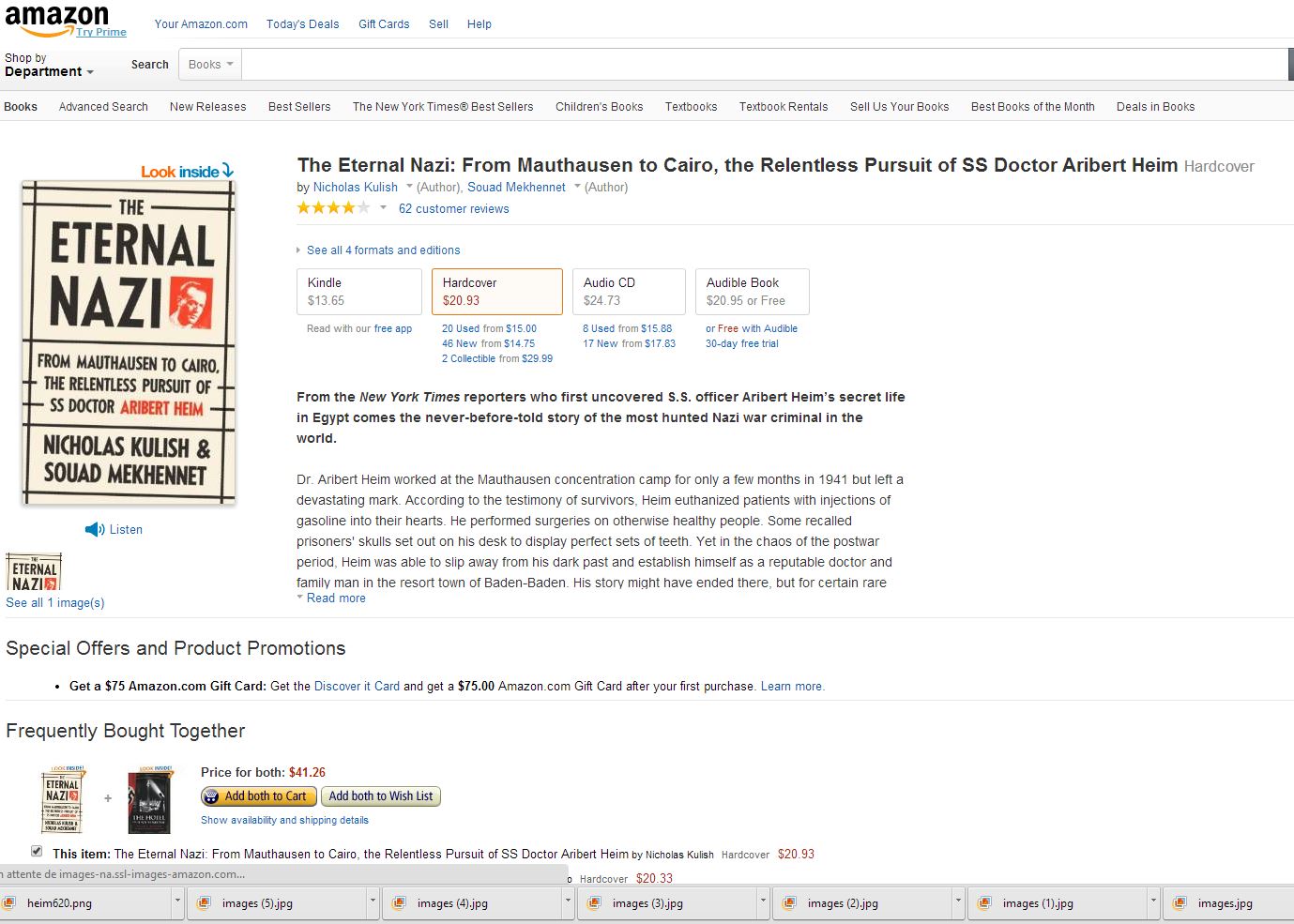 Nicholas Kulish and Souad Mekhennet tell Heim’s story in The Eternal Nazi: From Mauthausen to Cairo, the Relentless Pursuit of SS Doctor Aribert Heim, and it’s a horrifying one. Heim apparently enjoyed injecting gasoline directly into the hearts of inmates, especially Jews. Sometimes he would cut off the head of a corpse and, after baking the flesh off, give the skull to a friend or display it as a trophy. He once told a 12-year-old Jewish boy, before giving him a fatal injection, that his death was merited because the Jews had started the war.