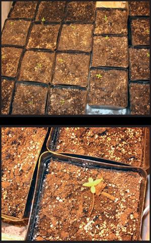 Après être sorties de la graine, les petites plantes illustrées ci dessus furent plantées dans le mélange Royalty de Palgron. Cette terre fertilisée contient assez de nutriments pour quelques semaines. Durant ces premières semaines, je leur donne du stimulant pour racines. Avec le temps, les plantes commencent à grandir de plus en plus vite. Comme incitant supplémentaire durant cette période de croissance, je leur ai également donné de l’Alga Groei, un engrais liquide de Palgron. Ce n’est pas absolument vital car il y a assez de nutriments dans le mélange de terre mais je peux ainsi en maintenir le niveau nutritionnel. Sans cela, la terre peut être vidée de ces nutriments après quelques semaines. En la réalimentant régulièrement, on évite de devoir en apporter une grande quantité soudainement. C’est clair ce que je dis là? Bien entendu, il faut éviter de donner trop d’engrais. Durant la période de croissance, il n’y a pas grand-chose d’autre à faire que d’apporter du stimulant pour les racines et de l’engrais liquide. La lampe doit se trouver à environ 30-40cm au-dessus de la plante. Il suffit de placer sa main en dessous de la lampe à hauteur des plantes pour mesurer la chaleur qu’elle dégage. La distance correcte varie en fonction de la taille de l’espace de culture et du nombre de lampes qui s’y trouvent. S’il y a une bonne circulation de l’air, les lampes peuvent pendre un peu plus bas car l’air chaud est immédiatement remplacé dans l’entourage des plantes et cela leur cause moins de stress qu’une extinction totale. L’humidité de l’air doit être maintenue aussi élevée que possible durant les premières semaines pour que les plantes puissent grandir plus vite et le feuilles sortir plus facilement. Un taux élevé  l’humidité dans l’air peut faire des miracles et on peut y arriver en réduisant l’extraction d’air. Un humidificateur peut être très utile aussi! La  température doit se situer entre 22 et 28 degrés Celsius le jour et entre 18 et 22 degrés la nuit. Il ne faut pas que la température descende sous  les 16 degrés car la croissance diminuerait. N’oubliez pas de laisser vos lampes travailler un maximum durant la nuit car l’électricité est alors moins chère (si vous avez un compteur de nuit bien sûr) et cela peut vous faire économiser quelques euros. Les plantes vertes ont maintenant grandi, vous pouvez caresser les tiges vigoureuses et savourer le goût et l’odeur de votre prochaine récolte. Il faut encore quelques mois de patience avant de pouvoir jouir des lourdes têtes qui vont en être récoltées.