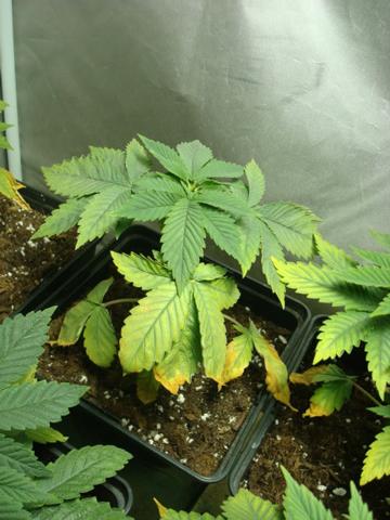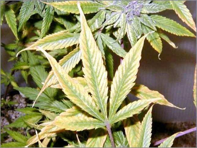 Les carences en azote, potassium ou phosphore sont celles qu’on rencontre le plus couramment. Ces déficiences en azote et potassium apparaissent surtout pendant la période de croissance. Selon mon expérience, il s’agit en général d’un manque de potassium. Le manque d’azote est facile à repérer car les bords extérieurs des feuilles commencent à jaunir et les feuilles proches des tiges sont plus jaunes. La plante suce tout l’azote hors des feuilles proches des tiges car elle n’en trouve pas assez ailleurs. Les vieilles feuilles sont drainées et leur nutriments sont emportés là où un feuillage est produit. Le manque de potassium est la déficience que je rencontre le plus souvent et on le reconnaît aux feuilles qui jaunissent des extrémités vers la veine centrale. C’est facile à distinguer d’un manque d’azote. Parfois, vous  aurez les deux en même temps et dans ce cas, la feuille va jaunir à la fois des bords extérieurs et près de la veine centrale. C’est durant la floraison que vous avez le plus de chance de rencontrer un manque de phosphore et/ou de potassium. Un manque de phosphore est plus difficile à reconnaître. La plante se couvre d’un mauve foncé partout. La floraison est interrompue également et elle reste plus petite. Mais il faut savoir que cette déficience, si elle est de courte durée, n’est pas dommageable pour la plante. Les carences sont faciles à repérer et l’ont peut y remédier facilement aussi. En donnant plus de nourriture à votre plante, vous pourrez regardez les feuilles jaunes rependre leur belle couleur verte. Elles se gorgent d’azote, de phosphore et de potassium frais jusqu’à en être pleine. C’est pour cela que pour un débutant, il vaut mieux sous-alimenter que sur-alimenter.  De cette manière, vous pouvez étudier les limites de vos plantes, en leurs laissant expérimenter des carences. Il faut toujours commencer avec peu aux plantes et après un certain temps, leur donner un peu plus car jusqu’à présent, elles vont bien. Si après cela vous rencontrez des problèmes, dont vous ne connaissez pas les raisons, vous pouvez vous dire que c’est du sérieux. Si vous savez reconnaître une carence, vous pouvez directement régler le problème et l’évacuer pour chercher les autres causes.  C’est pour cela que c’est une bonne idée de commencer la culture en prenant une seule plante sur laquelle on peut faire des expériences en ne lui donnant aucun engrais  supplémentaire et en attendant qu’elle développe des carences. En faisant cela, essayez de trouver quelle carence vous allez expérimenter en discutant des symptômes sur des forums en ligne et demandez conseil ou en parler avec vos amis. Quand vous maîtriserez tout cela sur le bout des doigts,  vos futures cultures se dérouleront confortablement.