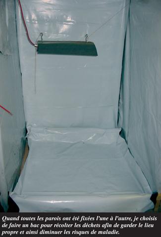 Notre but est de construire un espace opaque et hermétique dans lequel l’air frais riche en CO2 entre par un côté, circule et ressort par l’autre côté. Une pompe aspirante suffisamment puissante assure la circulation de l’air et un ventilateur mélange l’air frais entrant avec l’air chauffé par les lampes pour que la température soit la même d’un bout à l’autre de l’espace. Il suffit d’y ajouter des murs réfléchissants pour maximiser l’effet de la lumière et un bac pour garder le tout bien propre et le tour est joué. L’espace de culture est prêt à être planté! Quand toutes les parois ont été fixées  l’une à l’autre, je choisis de faire un bac pour récolter les déchets afin de garder le lieu propre et ainsi diminuer les risques de maladie. Pour qu’un mètre carré soit le plus efficace possible, je place un écran réfléchissant tout autour. On peut ainsi mieux contrôler la température et créer un espace totalement opaque à la lumière.