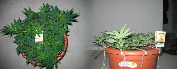 Pendant la période de floraison, nous allons passer à une nourriture pour floraison et nous pouvons ranger au placard les nutriments de croissance qui restent pour la prochaine fois. Si vous avez utilisez un sol bien pré-fertilisé, vous aurez facilement pu rester plusieurs semaines sans utiliser d’engrais liquide. Bien entendu, la période de pré-croissance ne devrait pas durer trop longtemps sinon vous devrez utiliser des engrais de croissance. Pour cette culture, nous avons uniquement utilisé les nutriments Plagron, certaines marquent utilisent une seule bouteille aussi bien pour la croissance que pour la floraison tandis que d’autres font des nutriments séparés pour la croissance et la floraison. De nombreux cultivateurs continuent également à donner à leurs plantes des nutriments de croissance pendant la première et parfois la  deuxième semaine de la période de floraison car c’est une sorte de phase de transition et les plantes ont encore une grande soif d’azote et d’autres briques de  construction pour leur développement rapide. En faisant cela, on peut également obtenir de plus grandes plantes car les nutriments de floraison stimulent la plante à tourner son attention (et ses ressources) vers la formation des têtes plutôt qu’à croître sa taille. De cette façon, avec vos engrais, vous pouvez un peu jouer avec la taille éventuelle de la plante. Si vous avez déjà des plantes d’une bonne taille et préférez qu’elles restent plus denses à cause de l’espace restreint disponible pour elles, donnez leurs immédiatement de l’engrais pour floraison. Par contre, si vos plantes sont plus petites et ne risquent pas d’envahir tout l’espace à ce moment et que vous désirez accroître leur taille autant que possible, vous pouvez continuer à leur donner de l’engrais de croissance un peu plus longtemps pour les stimuler. Bien entendu, ces différences ne sont pas grandes mais les moindre petites choses aident parfois, et quelques centimètres en plus par-ci par-là peuvent faire une grande différence.  Après trois semaines de floraison vous remarquerez que les plantes ont atteint leur taille maximale. Les plantes ont fini de grandir et de s’étoffer et vont maintenant commencer le véritable travail en formant leurs têtes. A ce stade, il est important de leur donner de l’engrais de floraison car la plante a besoin de plus de phosphore et de calcium. Ce sont les blocs de construction les plus importants pour un bon développement des têtes. Cela signifie qu’il est temps de sortir votre bouteille de PK 13-14. Le PK 13-14 (j’utilise le Plagron PK Plus) est un engrais de floraison séparé utilisé comme complément à votre engrais de floraison habituel. Comme vous aurez pu le deviner d’après son nom, il contient un supplément de phosphore et de calcium dont votre plante a réellement besoin pour vous récompenser avec de belles grosses têtes. Il y a deux manières d’administrer le PK 13-14. Vous pouvez commencer avec de petites doses durant la première semaine et augmenter la dose progressivement chaque jour. Commencez avec 0,25 ml par litre la première semaine pour arriver à 0,75 ml par litre la troisième semaine. La quantité nécessaire est généralement inscrite sur le dos de bouteille. La seconde manière de faire est d’attendre que la quatrième semaine de floraison ait commencé car c’est le moment où commence le plus gros développement des têtes et donnez leur alors directement 1,5 ml par litre et continuez ainsi jusqu’à la fin de la floraison. En résumé, utiliser du PK 13-14 rend les têtes plus dures et plus denses en apportant à la plante des matériaux de construction riches et sains.  N’oubliez pas non plus qu’à ce stade, vous devez tailler sur mesure les apports d’engrais en fonction des besoins de la plante. La plante a maintenant développé des besoins nutritionnels très différents de quand elle nécessitait une alimentation importante durant les trois semaines précédentes. Si vous continuez à lui donner autant d’engrais que vous lui en donniez auparavant, vous courrez le risque de les sur-fertiliser très vite. Si vous leur donniez de l’engrais tous les jours durant les premières semaines, elles n’en ont maintenant besoin plus que d’un jour sur deux, par exemple. Il faut y faire attention. Chaque plante fleurit à sa façon. Sur certaines variétés, les têtes grandissent très vite entre la troisième et la cinquième semaine tandis que d’autres variétés ne mettent le paquet sur le poids mesuré en grammes seulement lors de la cinquième semaine de floraison. Cela veut dire qu’il faut que vous soyez très attentifs à vos plantes (et que vous les écoutiez) afin de savoir quels sont leurs besoins nutritifs à tous moments. J’en parle car de nombreux cultivateurs débutants commencent bien puis croient qu’ils ont tout en main et quand les besoins de la plante changent après quelques semaines et que le cultivateur reste sur ses habitudes, cela peut lui donner une pauvre récolte en définitive.