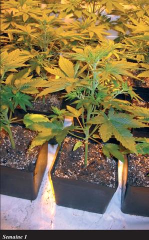 Les plantes fleurissent avec enthousiasme et sont nourries avec de l’Alga Bloom. Tous les jours, je les pulvérise avec du Phytamin Leaf Feed et pour stimuler la floraison, j’applique du Repor Forte de Plagron qui sert à assurer un transport plus important de sucres des feuilles semaines, je leur apporte également des enzymes. Ces enzymes nettoient le médium en supprimant les racines mortes et réduit les amas de sels formés par les engrais.  Les plantes originaires de graines ont tendance à pousser en hauteur plus tôt que les clones. Ainsi, elles seront maintenant nettement plus grandes et pour cette raison, je recommande fortement, si vous disposez d’un espace limité en hauteur, d’étêter ou de replier vos plantes dès maintenant. Vous replierez la plante en pliant la tête centrale vers le bas et en la fixant avec une corde sans trop la tendre. En faisant ainsi, vous obtenez le même résultat qu’avec l’écimage (couper le sommet de la plante) mais avec l’avantage de garder la tête centrale. Les branches latérales situées le plus bas vont former plus de têtes, sur un périmètre plus large. Les plantes devront être étêtées ou repliées dans les espaces de cultures plus bas qu’un mètre et demi ou alors, il faudra les laisser moins longtemps en période de croissance.  Il vaut mieux trop peu d’engrais que trop mais s’il vous arrivait d’être face à une carence sévère que vous ne pouvez pas pallier en recommençant avec l’engrais de floraison, le moyen le plus rapide de résoudre le problème est d’appliquer de l’engrais pour feuilles. Préparez votre mélange d’engrais comme d’habitude et pulvériser la plante avec ce mélange. Les plantes peuvent également absorber des nutriments par les feuilles et l’avantage de procéder ainsi, c’est que vous ne changez pas le pH de votre médium. Il vaut mieux pulvériser les plantes juste avant l’extinction des lampes et/ou juste avant des les rallumer. Le problème qui se présente quand on a affaire à une carence importante, c’est que quand vous donnez à la plante un engrais liquide (via le médium), il faut attendre que la plante ait à nouveau soif. Il ne sert à rien de donner de l’engrais liquide tous les jours si la plante ne peut pas absorber ce dont elle a besoin. Vous êtes forcés d’attendre un peu, certainement plus longtemps que vous ne le voulez, avant de pouvoir ajuster la carence convenablement. En combinant l’arrosage avec la pulvérisation des feuilles, la plante reçoit immédiatement ce dont elle a besoin au travers des feuilles.Généralement, vous pourrez voir le résultat dès le lendemain. Vous pourrez observer que les taches jaunes sur les feuilles rattrapent de la couleur. En continuant de donner de l’eau enrichie et de pulvériser les feuilles, les plantes vont rapidement retrouver leur superbe teint vert. L’autre avantage de l’alimentation par les feuilles, c’est que vous pouvez expérimenter en toute sécurité afin de trouver exactement de quelle carence souffre vos plantes. De nombreux cultivateurs sont rongés par le doute, se demandant s’il s’agit d’une sous-fertilisation ou d’un excès. En pulvérisant simplement les feuilles avec une solution nutritive, vous pourrez rapidement observer s’il y a une réaction positive ou négative de la plante et en déduire quel est le problème.  Il est toujours utile d’avoir sous la main des bouteilles remplies avec des nutriments isolés tels que de l’azote, du phosphore et du calcium. Avec celles-ci, il vous sera plus facile de faire vos expériences sur vos problèmes nutritionnels. Supposez que ce soit une carence en azote et que vous soyez forcés d’utiliser un engrais général pour y remédier; vous donnerez en même temps à la plante des éléments dont elle n’a pas besoin. Adoptez la manière simple en gardant des bouteilles séparées avec seulement de l’azote. Quand vous en ajouterez cela va augmenter le niveau d’azote des plantes sans influencer les autres composants nutritifs. Ce système de bouteilles est particulièrement utile pour les cultivateurs en extérieur qui cultivent de grandes plantes en pots et qui ont besoin d’une grande quantité d’azote. Spécialement pendant les vagues de chaleurs, il est pratique de pulvériser les plantes avec un engrais liquide d’azote ou de simplement augmenter le pourcentage d’azote dans l’eau d’arrosage. Evidemment, le même procédé peut être appliqué pour les carences de phosphore et de calcium.